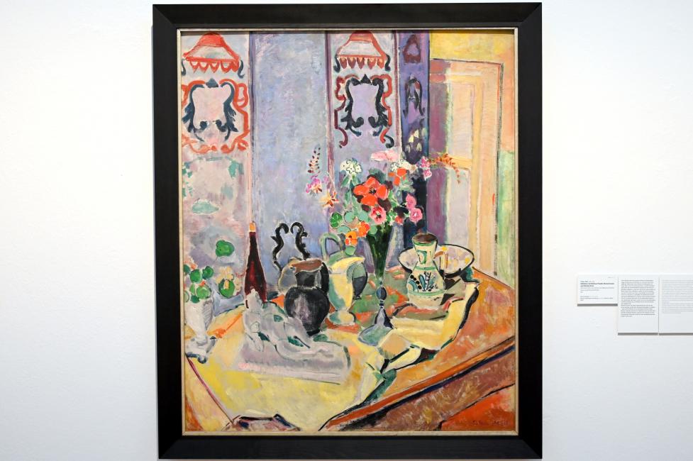 Stillleben mit Matisse-Plastik, Blumenvasen und Wandschirm