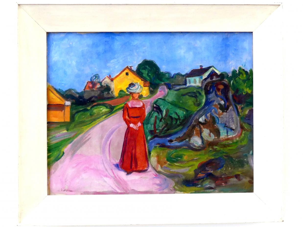 Gate i Åsgårdstrand med kvinne i rød kjole - Straße in Aasgaardstrand mit Frau im roten Kleid