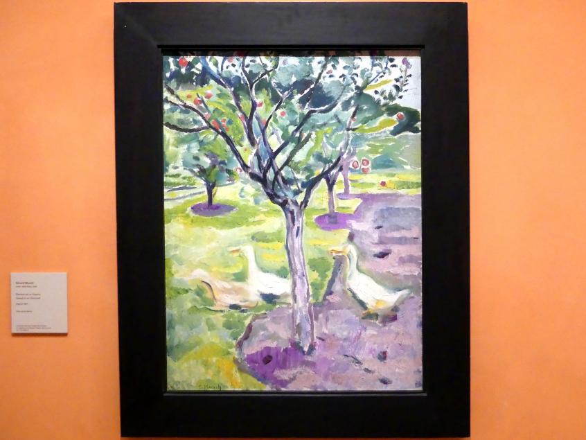 Gänse in einem Obstgarten