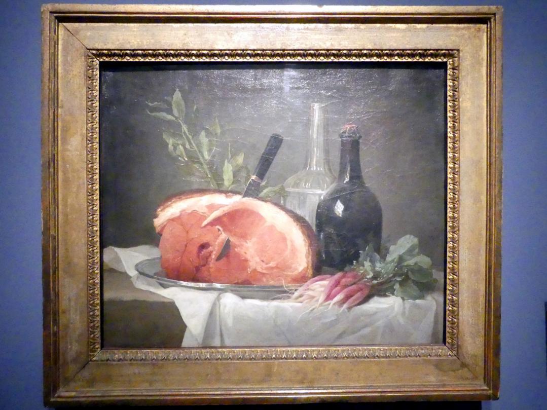 Stillleben mit Schinken, Flaschen und Radieschen