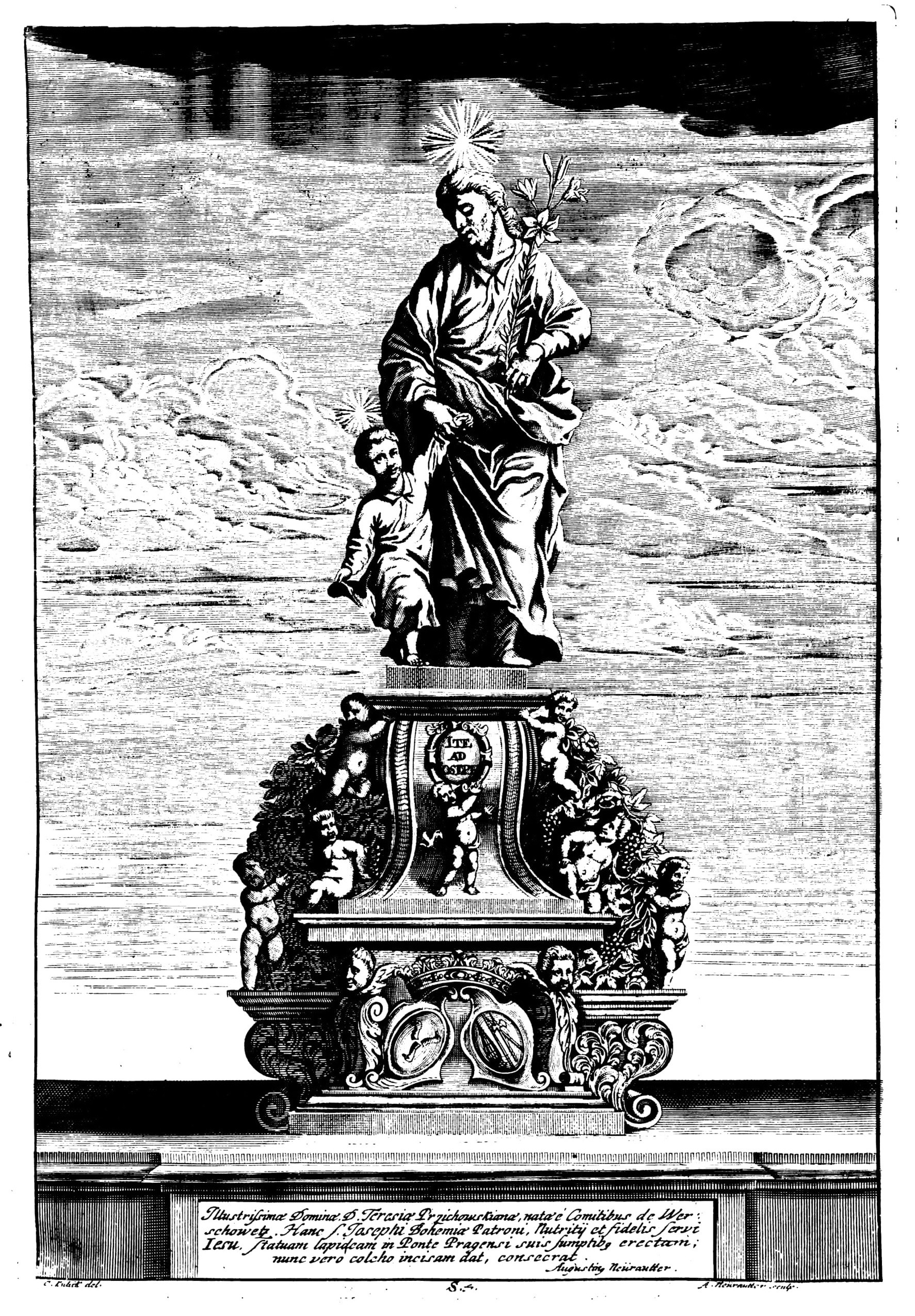 Reichgeschmücktes Postament mit Inschrifttafeln, Wappen, von einer Weinlaube mit Putten umgeben. Joseph, in weitem Gewande, führt den Christusknaben an der Hand. Sandstein. Anteil von Johann bzw. Ferdinand Brokoff unentscheidbar.