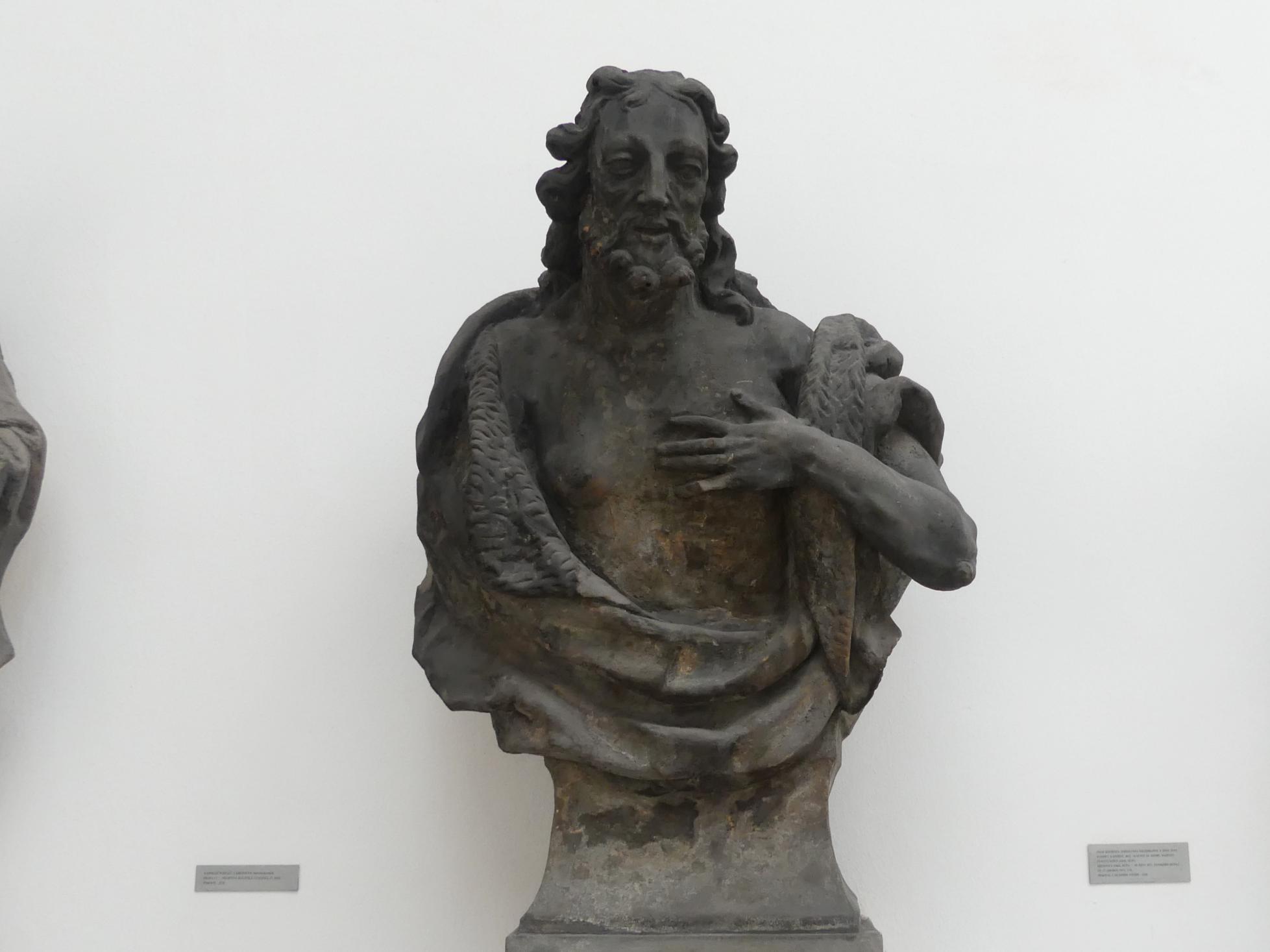 Auf der Weltkugel, die von den sitzenden, resp. halb knieenden Repräsentanten der vier Weltteile (eine Amerikanerin mit dem Elephanten, Königin Europa mit dem Ochsen, Königin Asia mit dem Kamel und ein Mohrenkönig mit dem Löwen) gestützt wird, steht im Meßgewande der Heilige Ignaz und hält in der Linken das strahlenumgebene Monogramm Christi in die Höhe. Zu Füßen der ganzen Gruppe sind zwei nackte Neger mit Federnschurz und Kopfschmuck gelagert, welche je ein Inschriftbild halten (nach alten Angaben sollen sie Indianer vorstellen). Die untere Gruppe ist umgeben von einem breiten Aufbau von kriegerischen Trophäen. Darüber sitzt links ober der Weltkugel ein Spanier mit dem Bildnisse des hl. Aloisius Gonzaga, rechts ein Pole mit dem Stanislaus Kostka (beide Heilige waren Mitglieder der Gesellschaft Jesu). Ganz unten zwischen den gelagerten Indianern befand sich noch ein Schild mit den Bildnissen der drei japanischen Jesuiten-Märtyrer Paul Miki, Johann de Goto und Jakob Kisai. Sandstein, überlebensgroß. Chronogramm mit der Legende = 1711.