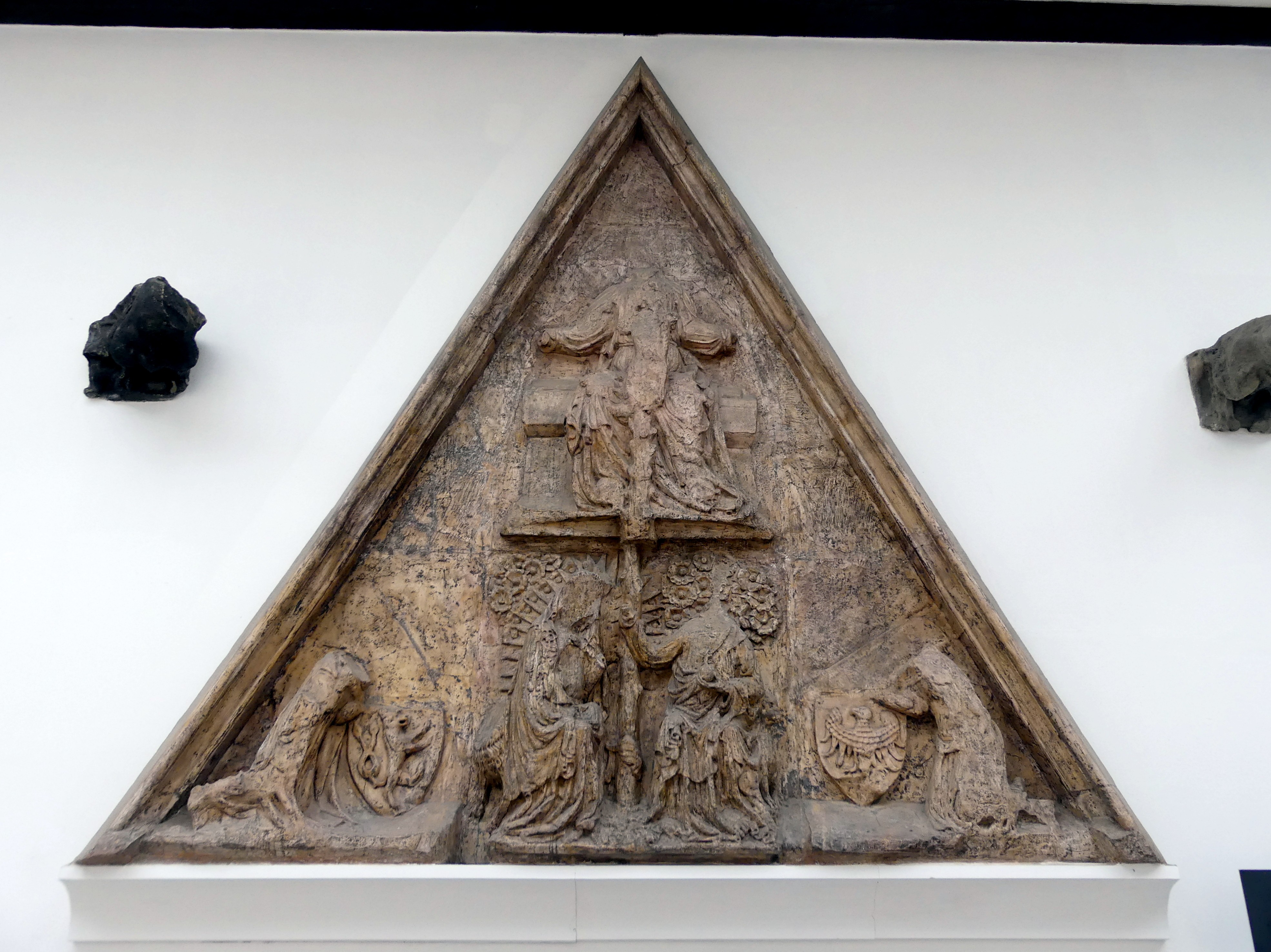 Krönung Mariens unter dem Gnadenthron Gottes und den verehrenden Figuren des römischen Kaisers Karl IV. (?) und seiner Frau, der böhmischen Königin Blanca Margarete von Valois (?). Gipskopie aus der Zeit vor 1932, Original Sandstein um 1350.