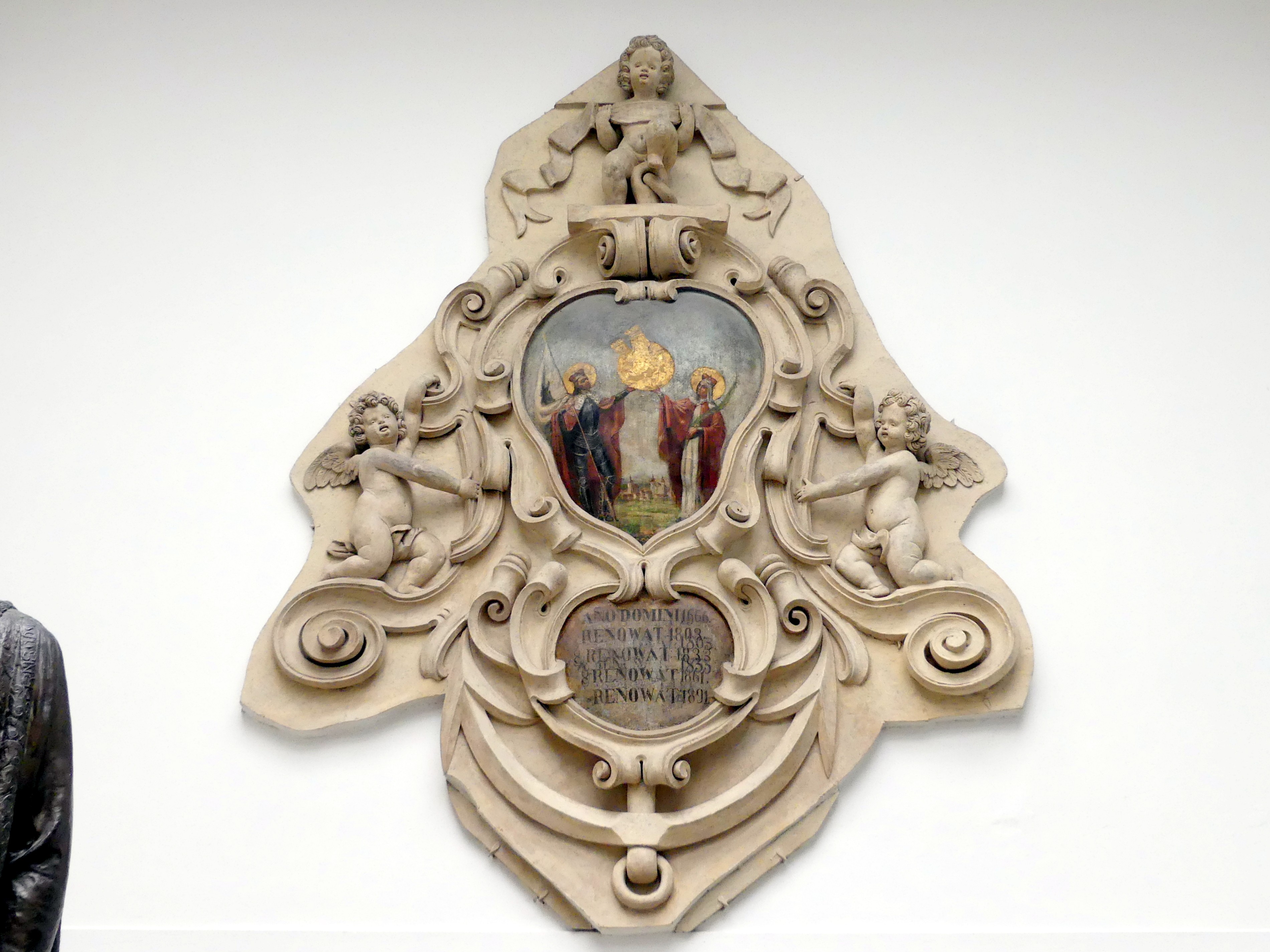 Hauswappen. Prag, ehem. Haus U Šálků auf dem Karlsplatz bei der Resslova Straße in der Prager Neustadt (abgerissen 1939), um 1640, Stuck mit Ölbild