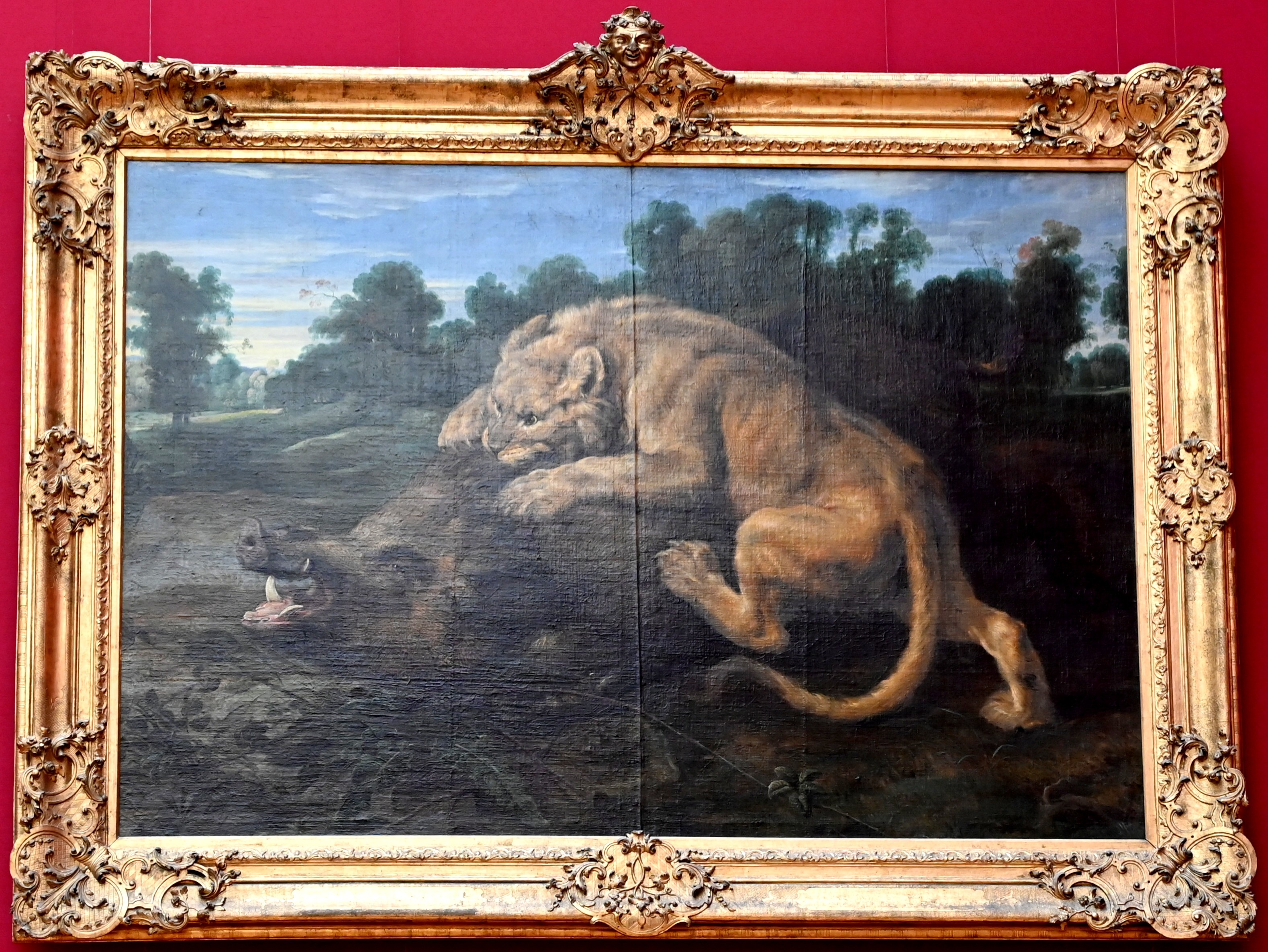Eine Löwin schlägt ein Wildschwein