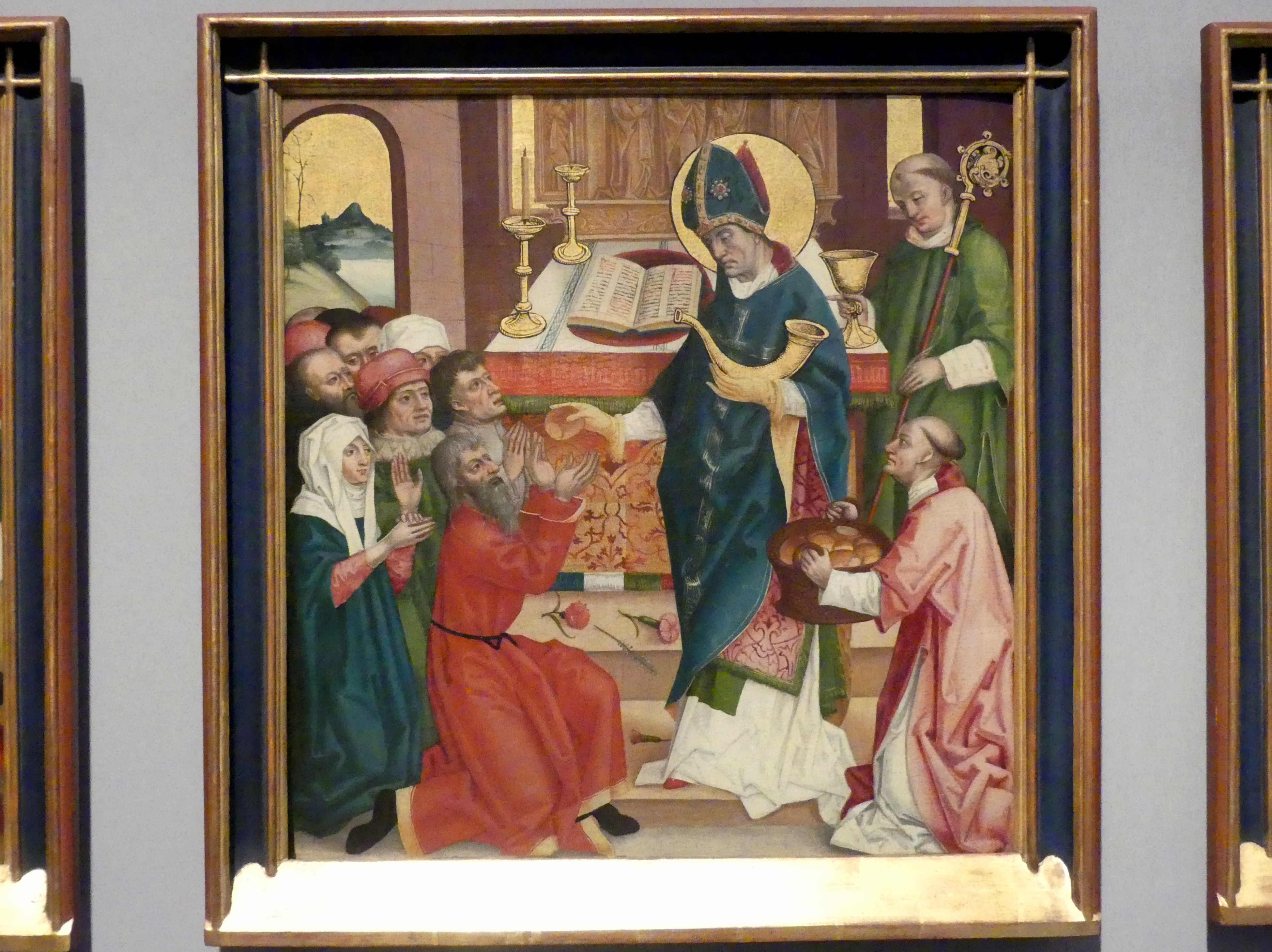 Der Heilige Hubert teilt als Bischof von Lüttich Brot und Wein an das Volk aus