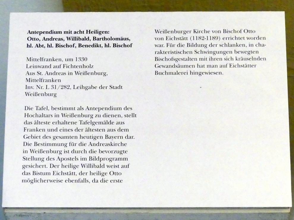 Antependium mit acht Heiligen: Otto, Andreas, Willibald, Bartholomäus, hl. Abt, hl. Bischof, Benedikt, hl. Bischof
