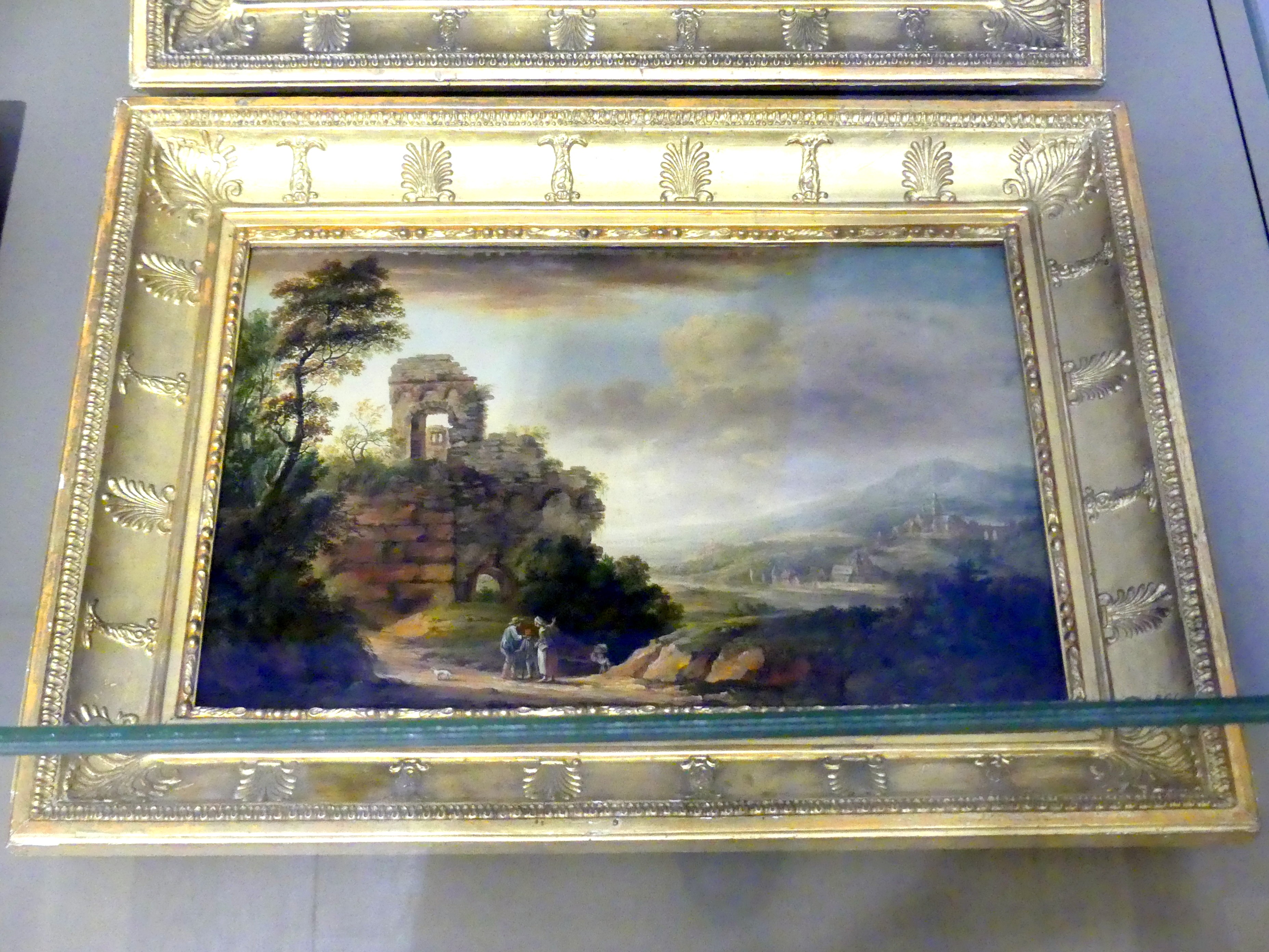 Flusslandschaft mit Ruine und Landbewohnern