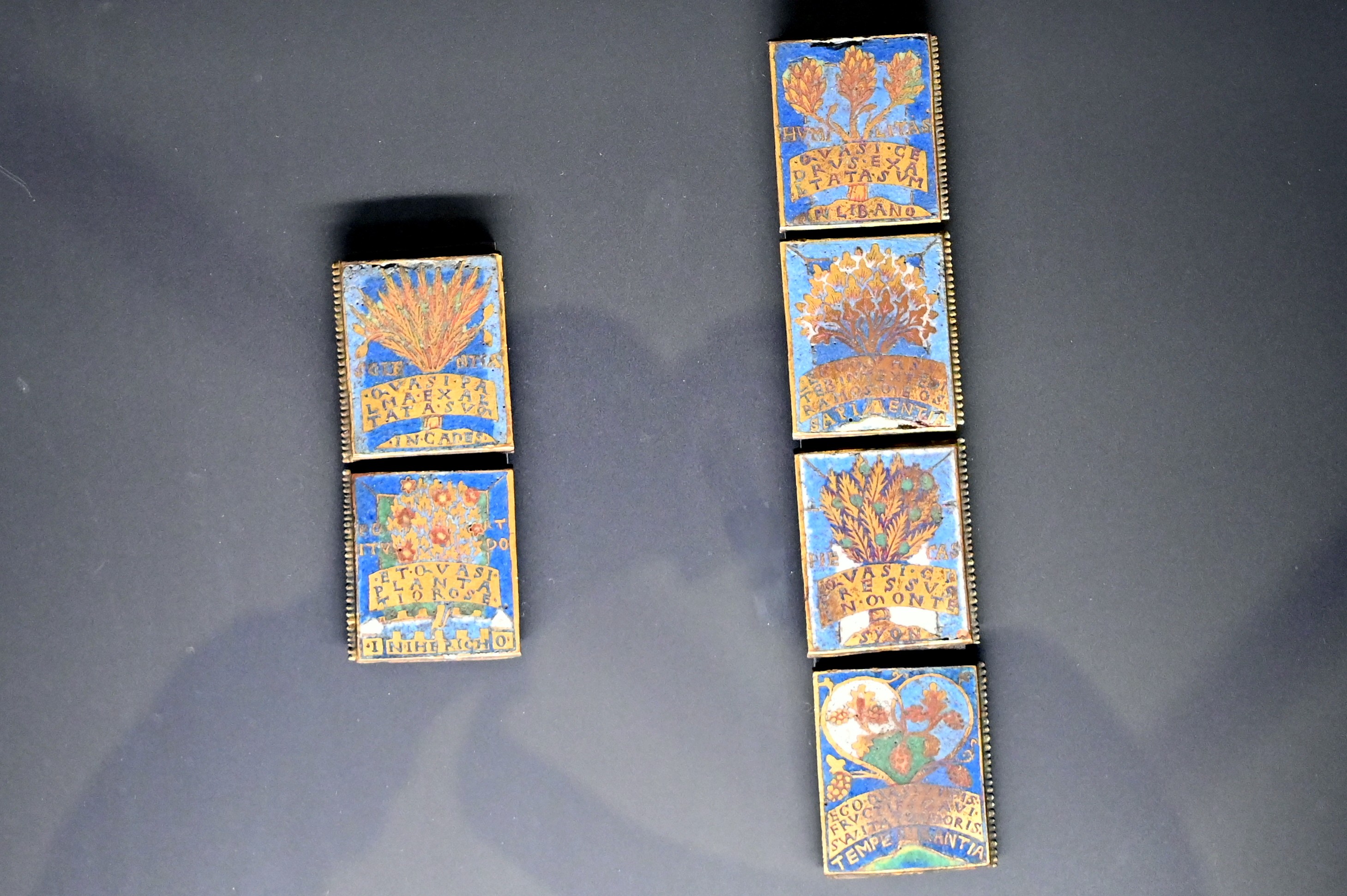 Sechs Emails mit Bäumen als Tugendallegorien