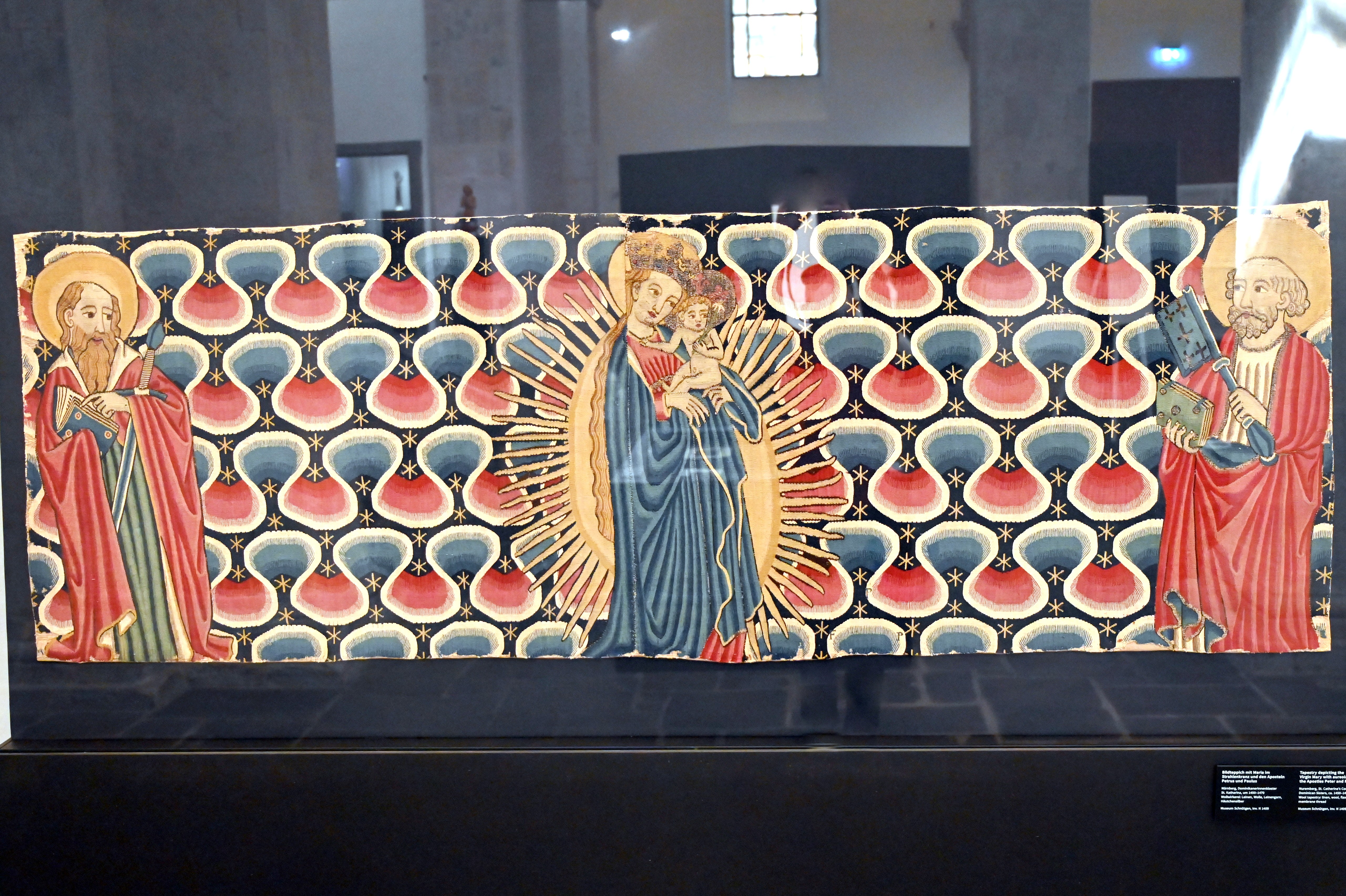 Bildteppich mit Maria im Strahlenkranz und den Aposteln Petrus und Paulus