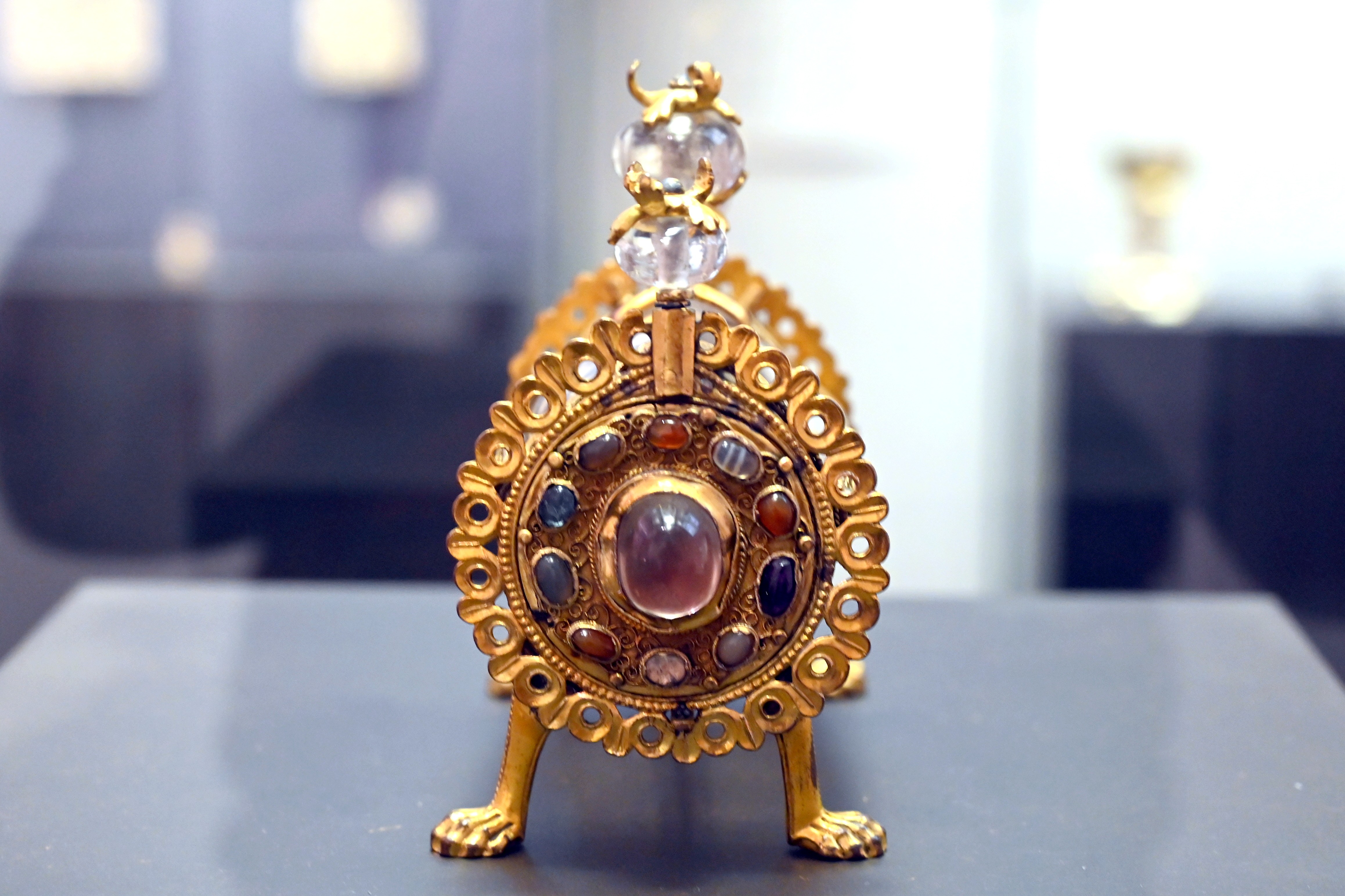 Bergkristall und Silber, vergoldet und Glas