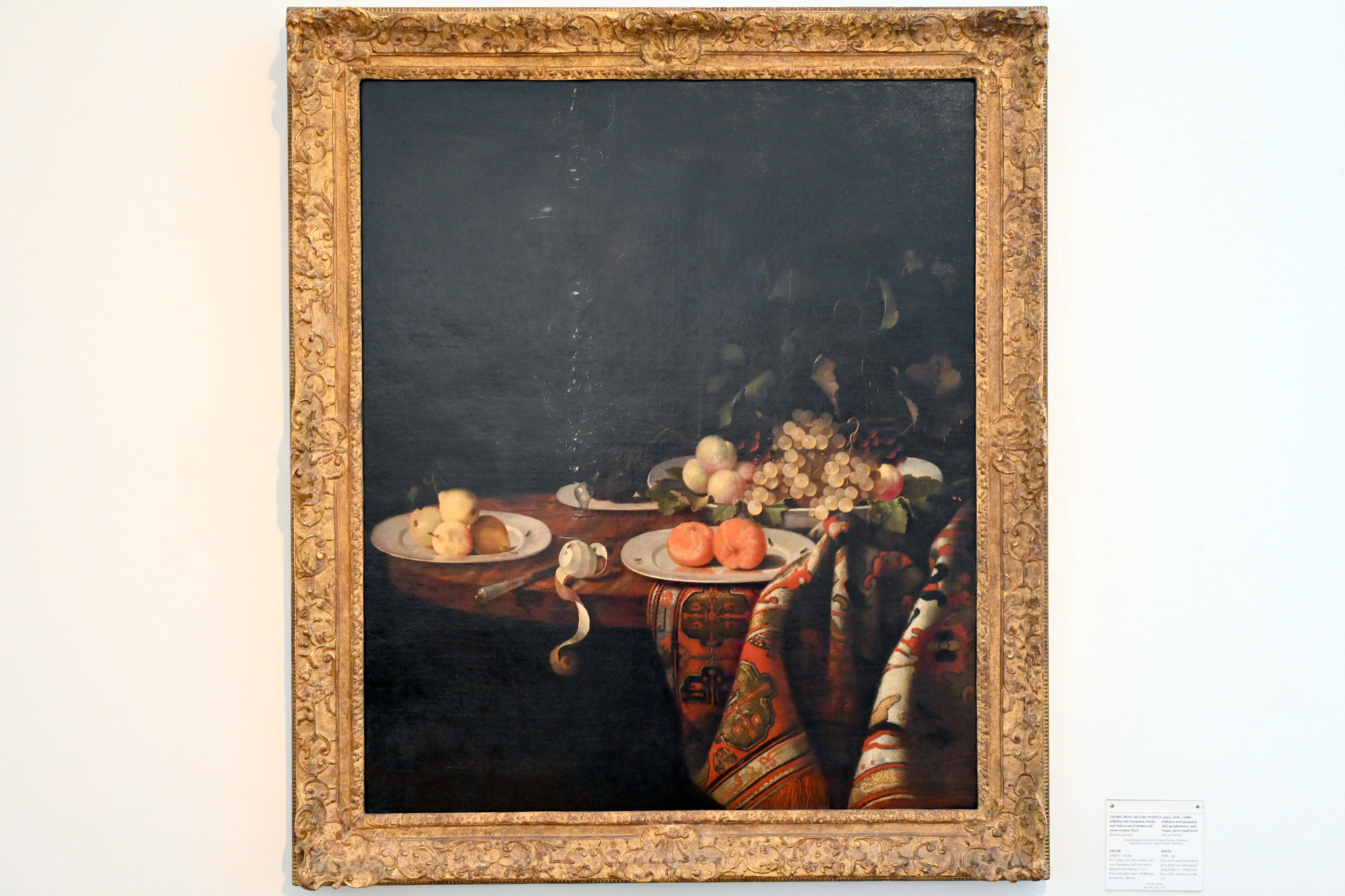 Stillleben mit Glaspokal, Schale und Tellern mit Früchten auf einem runden Tisch