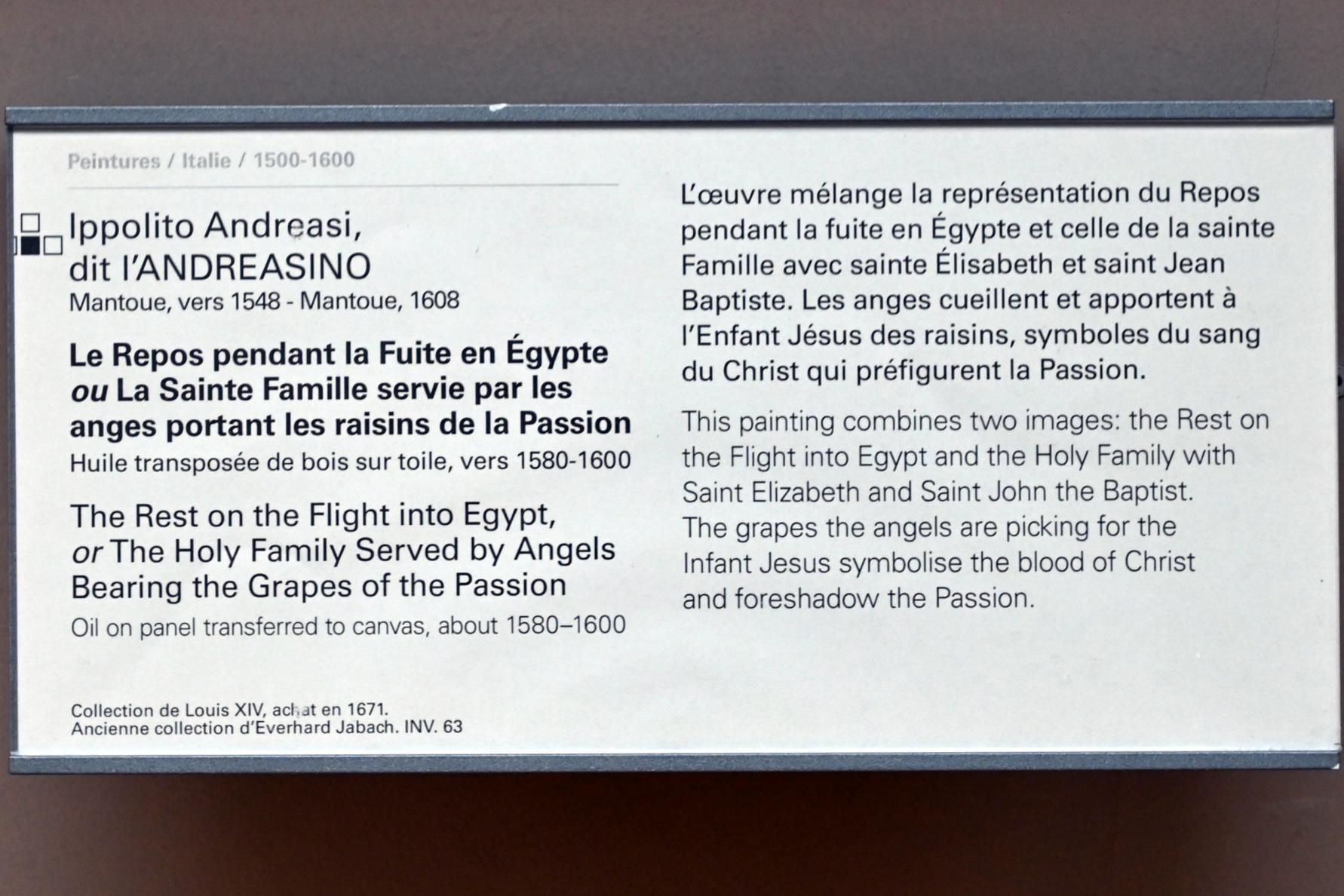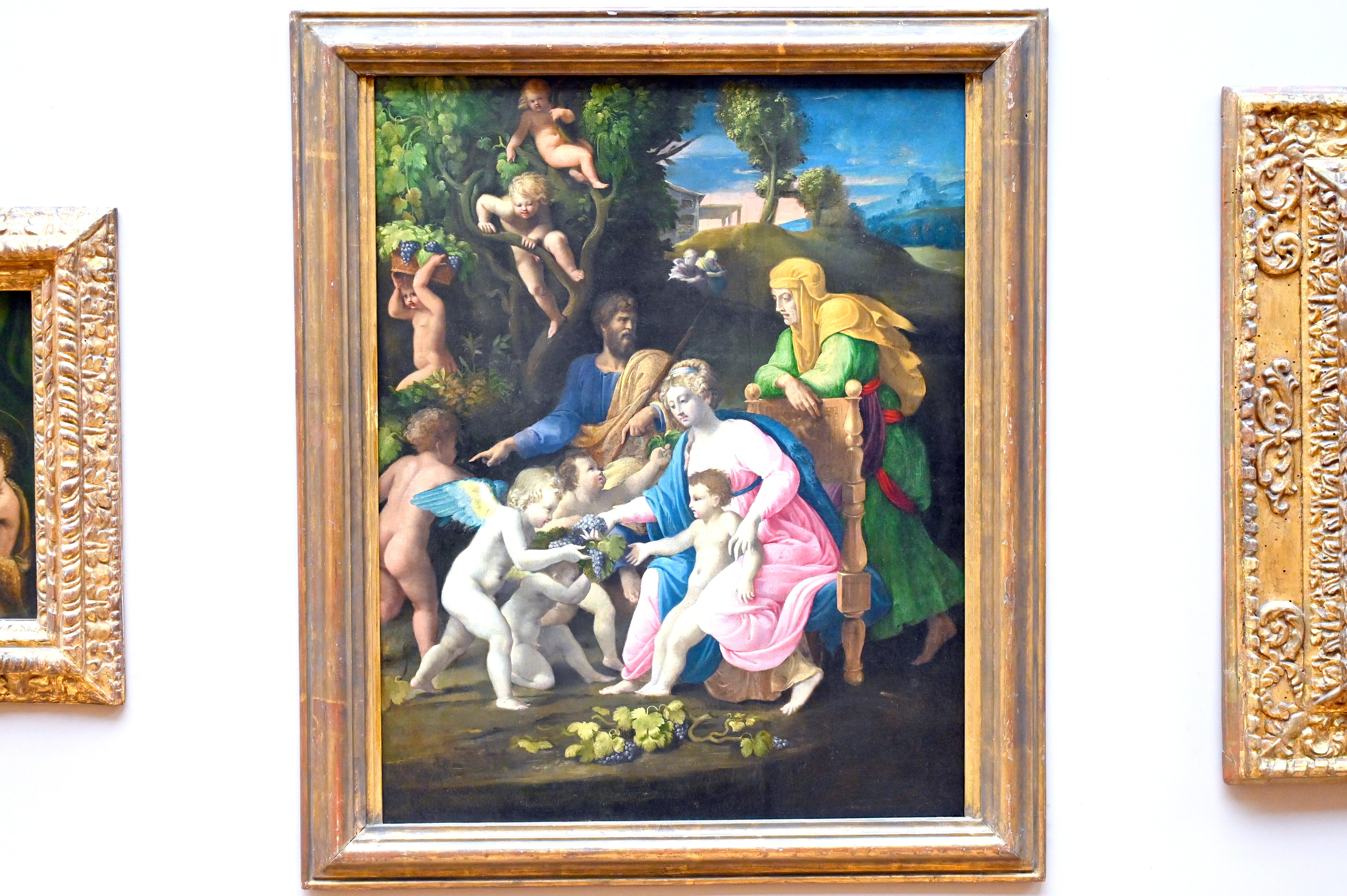 Die Ruhe auf der Flucht nach Ägypten (Die Heilige Familie, bedient von Engeln, die die Trauben der Passion tragen)