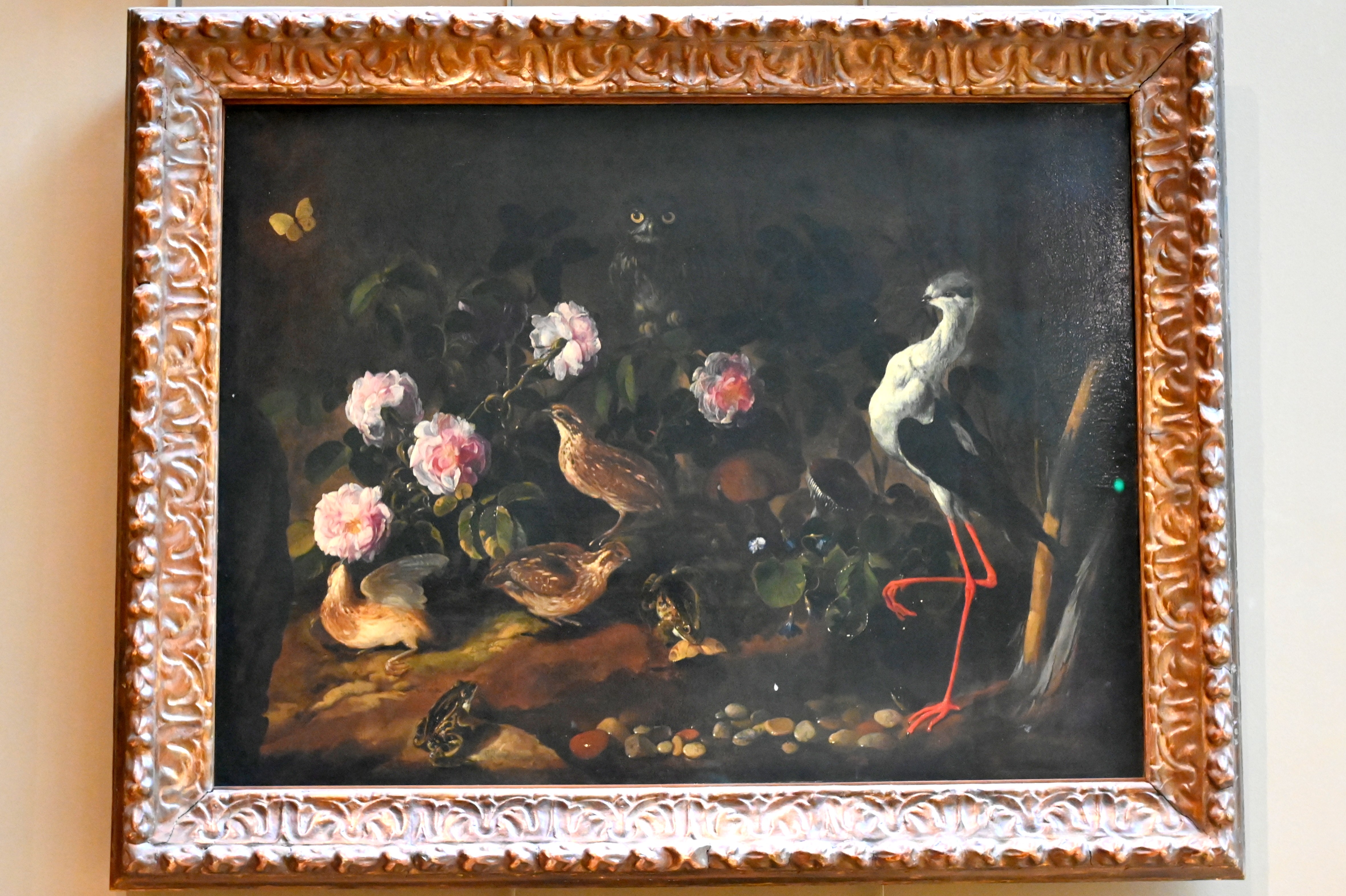 Stillleben mit zwei Wachteln, einer Eule und einem Stelzenläufer